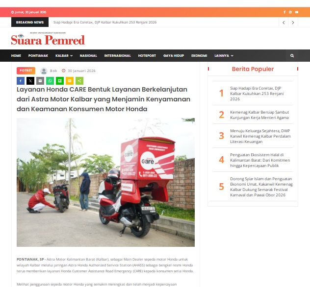 Layanan Honda CARE Bentuk Layanan Berkelanjutan dari Astra Motor Kalbar yang Menjamin Kenyamanan dan Keamanan Konsumen Motor Honda by masmul 30 Januari 2026 in Silahkan kunjungi https://www.suarapemredkalbar.com/read/potret/30012026/layanan-honda-care-bentuk-layanan-berkelanjutan-dari-astra-motor-kalbar-yang-menjamin-kenyamanan-dan-keamanan-konsumen-motor-honda. You Might Like Regional Public Launching New ADV160 The SUV Pride Grand Launching New PCX 160 Truly Exceptional! Tetap hati-hati ya bro sist berkendara saat hujan.