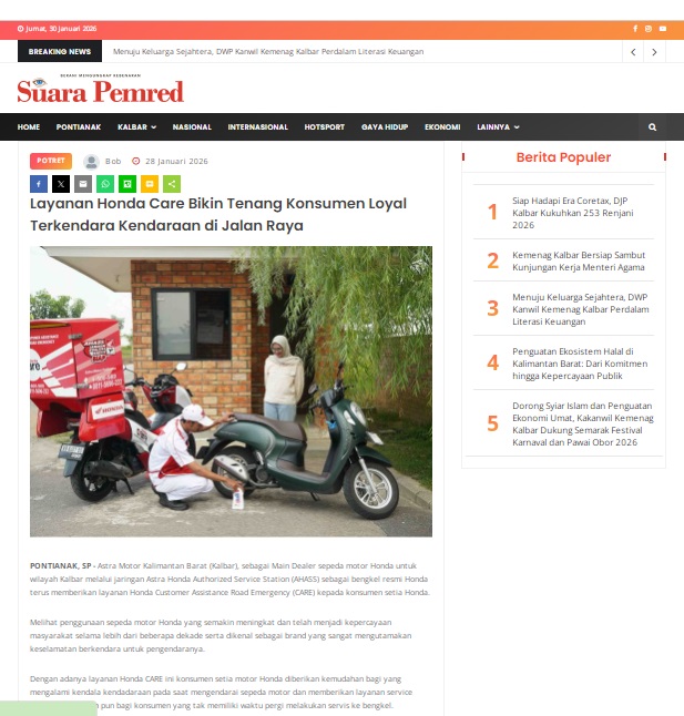 Layanan Honda Care Bikin Tenang Konsumen Loyal Terkendara Kendaraan di Jalan Raya by masmul 28 Januari 2026 in Silahkan kunjungi https://www.suarapemredkalbar.com/read/potret/28012026/layanan-honda-care-bikin-tenang-konsumen-loyal-terkendara-kendaraan-di-jalan-raya. You Might Like Regional Public Launching New ADV160 The SUV Pride Grand Launching New PCX 160 Truly Exceptional! Tetap hati-hati ya bro sist berkendara saat hujan.