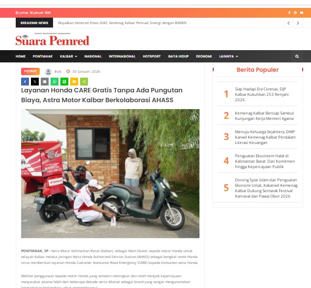 Layanan Honda CARE Gratis Tanpa Ada Pungutan Biaya, Astra Motor Kalbar Berkolaborasi AHASS by masmul 30 Januari 2026 in Silahkan kunjungi https://www.suarapemredkalbar.com/read/potret/30012026/layanan-honda-care-gratis-tanpa-ada-pungutan-biaya-astra-motor-kalbar-berkolaborasi-ahass. You Might Like Regional Public Launching New ADV160 The SUV Pride Grand Launching New PCX 160 Truly Exceptional! Tetap hati-hati ya bro sist berkendara saat hujan.