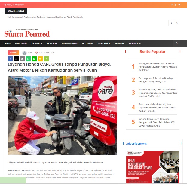 Layanan Honda CARE Gratis Tanpa Pungutan Biaya, Astra Motor Berikan Kemudahan Servis Rutin by masmul 18 Maret 2025 in Silahkan kunjungi https://www.suarapemredkalbar.com/read/potret/18032025/layanan-honda-care-gratis-tanpa-pungutan-biaya-astra-motor-berikan-kemudahan-servis-rutin. You Might Like Regional Public Launching New ADV160 The SUV Pride Grand Launching New PCX 160 Truly Exceptional! Tetap hati-hati ya bro sist berkendara saat hujan.