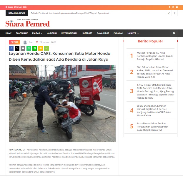Layanan Honda CARE, Konsumen Setia Motor Honda Diberi Kemudahan saat Ada Kendala di Jalan Raya by masmul 22 Januari 2026 in Silahkan kunjungi https://www.suarapemredkalbar.com/read/potret/22012026/layanan-honda-care-konsumen-setia-motor-honda-diberi-kemudahan-saat-ada-kendala-di-jalan-raya. You Might Like Regional Public Launching New ADV160 The SUV Pride Grand Launching New PCX 160 Truly Exceptional! Tetap hati-hati ya bro sist berkendara saat hujan.