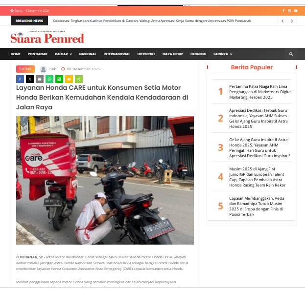 Layanan Honda CARE untuk Konsumen Setia Motor Honda Berikan Kemudahan Kendala Kendadaraan di Jalan Raya by masmul 8 Desember 2025 in Silahkan kunjungi https://www.suarapemredkalbar.com/read/potret/08122025/layanan-honda-care-untuk-konsumen-setia-motor-honda-berikan-kemudahan-kendala-kendadaraan-di-jalan-raya. You Might Like Regional Public Launching New ADV160 The SUV Pride Grand Launching New PCX 160 Truly Exceptional! Tetap hati-hati ya bro sist berkendara saat hujan.