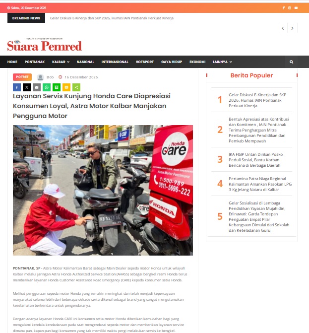 Layanan Servis Kunjung Honda Care Diapresiasi Konsumen Loyal, Astra Motor Kalbar Manjakan Pengguna Motor by masmul 16 Desember 2025 in Silahkan kunjungi https://www.suarapemredkalbar.com/read/potret/16122025/layanan-servis-kunjung-honda-care-diapresiasi-konsumen-loyal-astra-motor-kalbar-manjakan-pengguna-motor. You Might Like Regional Public Launching New ADV160 The SUV Pride Grand Launching New PCX 160 Truly Exceptional! Tetap hati-hati ya bro sist berkendara saat hujan.