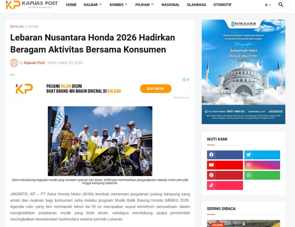 Lebaran Nusantara Honda 2026 Hadirkan Beragam Aktivitas Bersama Konsumen by Muhammad Arif 23 Maret 2026 in Silahkan kunjungi https://www.kapuaspost.web.id/2026/03/lebaran-nusantara-honda-2026-hadirkan.html. Tags: astra Astra Motor kalbar Astra Motor Pontianak astramotor honda kalbar pontianak sepeda motor You Might Like Regional Public Launching New ADV160 The SUV Pride Grand Launching New PCX 160 Truly Exceptional! Tetap hati-hati ya bro sist berkendara saat hujan.