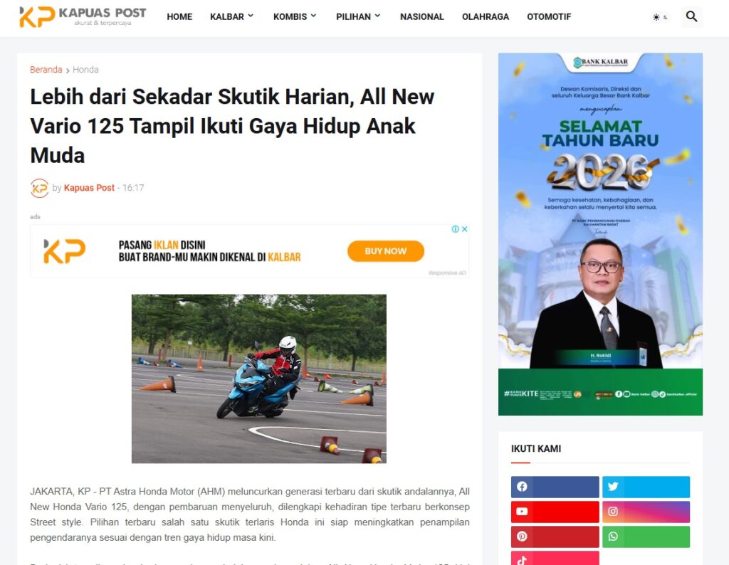 Lebih dari Sekadar Skutik Harian, All New Vario 125 Tampil Ikuti Gaya Hidup Anak Muda by Muhammad Arif 13 Januari 2026 in Silahkan kunjungi https://www.kapuaspost.web.id/2026/01/lebih-dari-sekadar-skutik-harian-all.html. Tags: astra Astra Motor kalbar Astra Motor Pontianak astramotor honda kalbar pontianak sepeda motor You Might Like Regional Public Launching New ADV160 The SUV Pride Grand Launching New PCX 160 Truly Exceptional! Tetap hati-hati ya bro sist berkendara saat hujan.