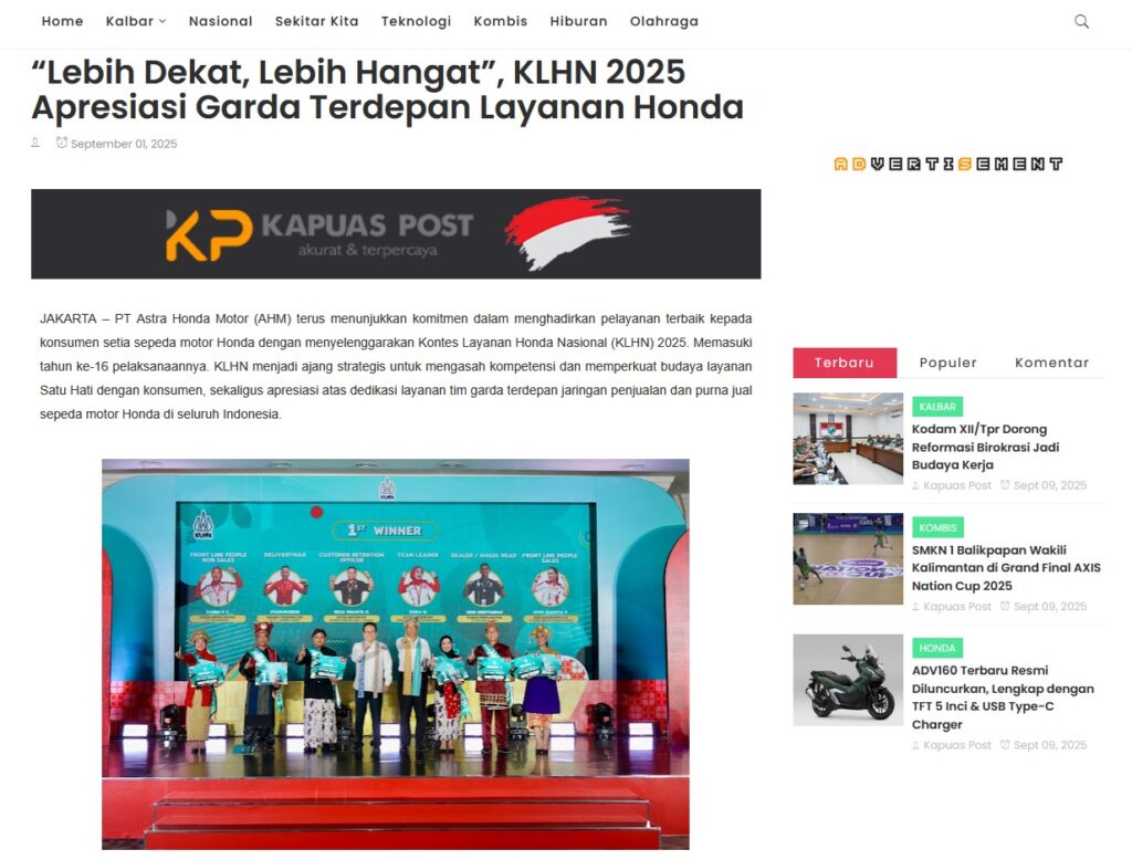 “Lebih Dekat, Lebih Hangat”, KLHN 2025 Apresiasi Garda Terdepan Layanan Honda by Muhammad Arif 1 September 2025 in Silahkan kunjungi https://www.kapuaspost.web.id/2025/09/lebih-dekat-lebih-hangat-klhn-2025.html. Tags: astra Astra Motor kalbar Astra Motor Pontianak astramotor honda kalbar pontianak sepeda motor You Might Like Regional Public Launching New ADV160 The SUV Pride Grand Launching New PCX 160 Truly Exceptional! Tetap hati-hati ya bro sist berkendara saat hujan.
