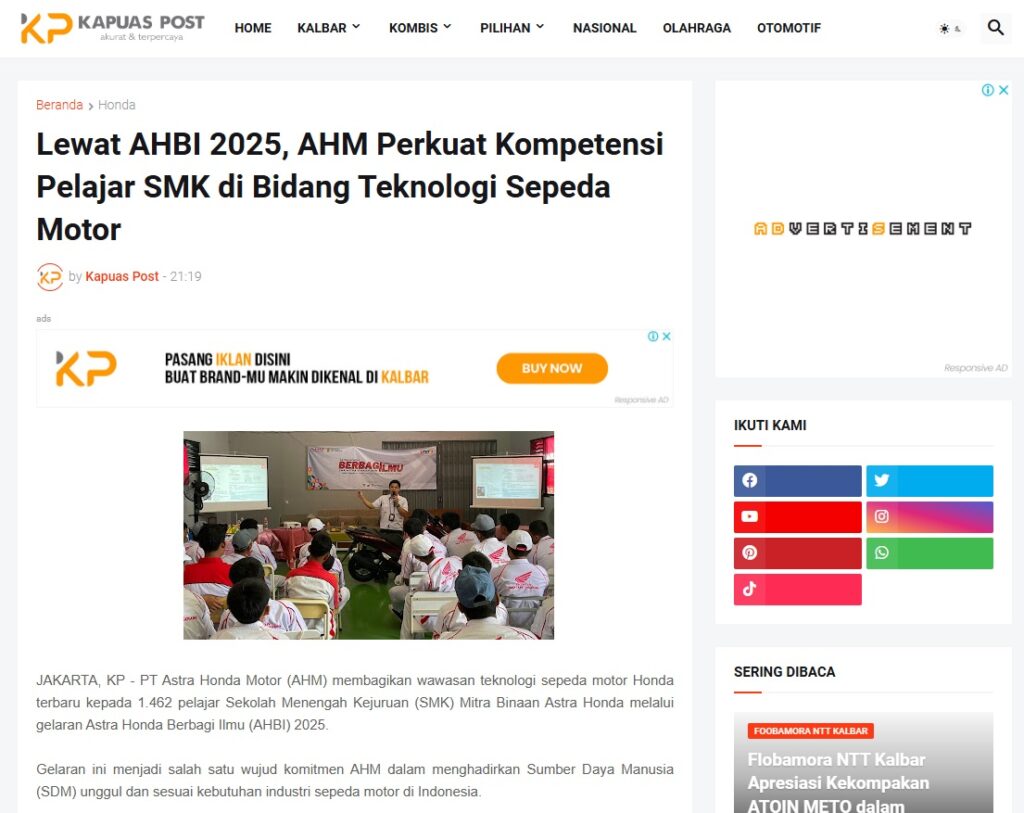 Lewat AHBI 2025, AHM Perkuat Kompetensi Pelajar SMK di Bidang Teknologi Sepeda Motor by Muhammad Arif 2 Februari 2026 in Silahkan kunjungi https://www.kapuaspost.web.id/2026/02/lewat-ahbi-2025-ahm-perkuat-kompetensi.html. Tags: astra Astra Motor kalbar Astra Motor Pontianak astramotor honda kalbar pontianak sepeda motor You Might Like Regional Public Launching New ADV160 The SUV Pride Grand Launching New PCX 160 Truly Exceptional! Tetap hati-hati ya bro sist berkendara saat hujan.