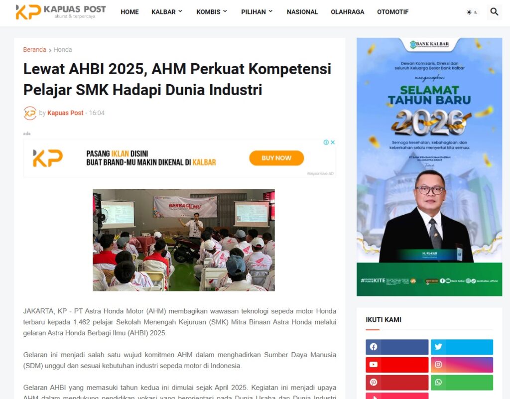 Lewat AHBI 2025, AHM Perkuat Kompetensi Pelajar SMK Hadapi Dunia Industri by Muhammad Arif 15 Januari 2026 in Silahkan kunjungi https://www.kapuaspost.web.id/2026/01/lewat-ahbi-2025-ahm-perkuat-kompetensi_18.html. Tags: astra Astra Motor kalbar Astra Motor Pontianak astramotor honda kalbar pontianak sepeda motor You Might Like Regional Public Launching New ADV160 The SUV Pride Grand Launching New PCX 160 Truly Exceptional! Tetap hati-hati ya bro sist berkendara saat hujan.