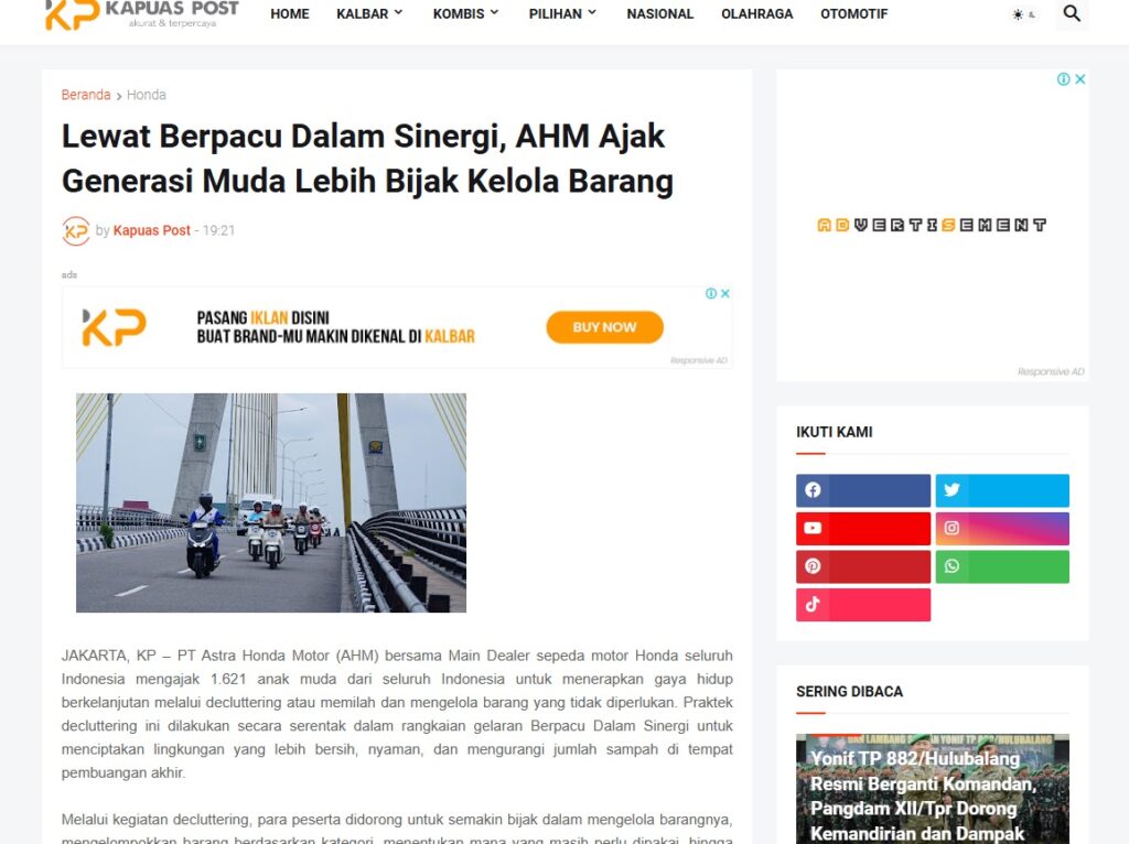 Lewat Berpacu Dalam Sinergi, AHM Ajak Generasi Muda Lebih Bijak Kelola Barang by Muhammad Arif 18 Januari 2026 in Silahkan kunjungi https://www.kapuaspost.web.id/2026/01/lewat-berpacu-dalam-sinergi-ahm-ajak.html. Tags: astra Astra Motor kalbar Astra Motor Pontianak astramotor honda kalbar pontianak sepeda motor You Might Like Regional Public Launching New ADV160 The SUV Pride Grand Launching New PCX 160 Truly Exceptional! Tetap hati-hati ya bro sist berkendara saat hujan.
