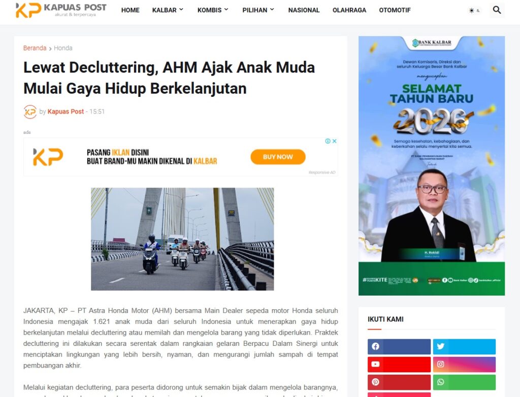 Lewat Decluttering, AHM Ajak Anak Muda Mulai Gaya Hidup Berkelanjutan by Muhammad Arif 12 Januari 2026 in Silahkan kunjungi https://www.kapuaspost.web.id/2026/01/lewat-decluttering-ahm-ajak-anak-muda.html. Tags: astra Astra Motor kalbar Astra Motor Pontianak astramotor honda kalbar pontianak sepeda motor You Might Like Regional Public Launching New ADV160 The SUV Pride Grand Launching New PCX 160 Truly Exceptional! Tetap hati-hati ya bro sist berkendara saat hujan.