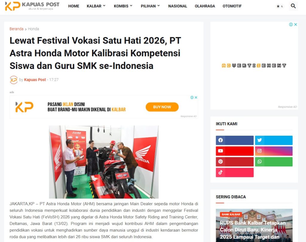 Lewat Festival Vokasi Satu Hati 2026, PT Astra Honda Motor Kalibrasi Kompetensi Siswa dan Guru SMK se-Indonesia by Muhammad Arif 18 Februari 2026 in Silahkan kunjungi https://www.kapuaspost.web.id/2026/02/lewat-festival-vokasi-satu-hati-2026-pt.html. Tags: astra Astra Motor kalbar Astra Motor Pontianak astramotor honda kalbar pontianak sepeda motor You Might Like Regional Public Launching New ADV160 The SUV Pride Grand Launching New PCX 160 Truly Exceptional! Tetap hati-hati ya bro sist berkendara saat hujan.