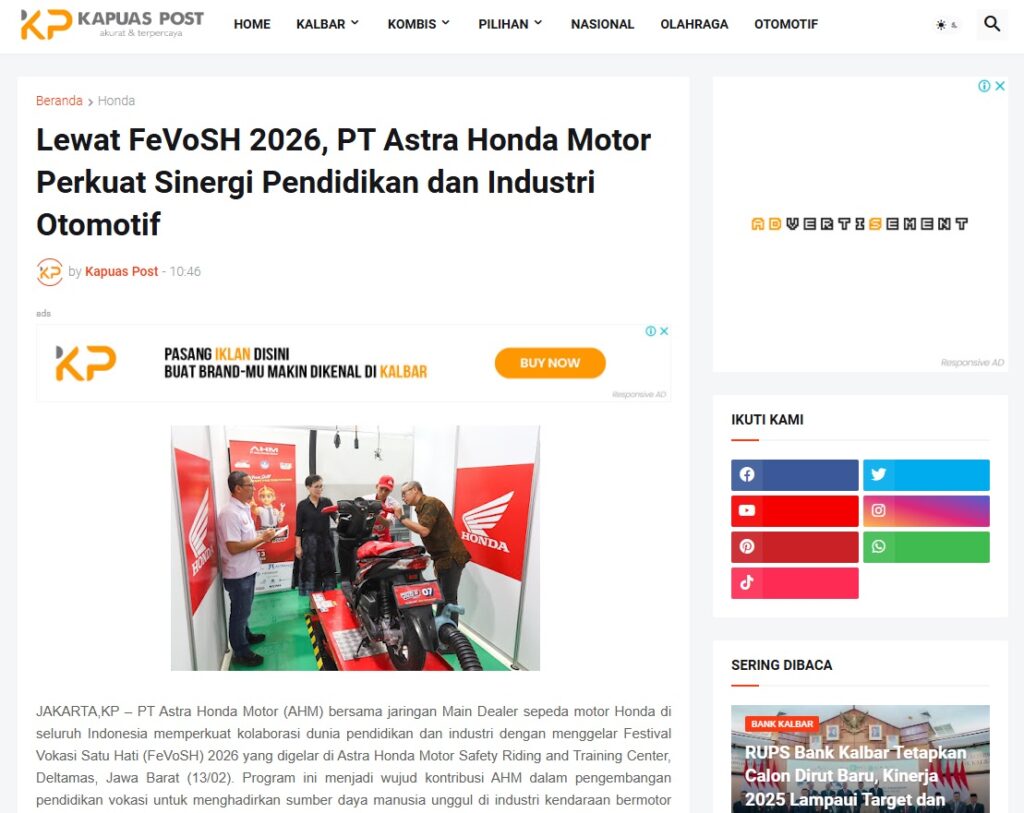 Lewat FeVoSH 2026, PT Astra Honda Motor Perkuat Sinergi Pendidikan dan Industri Otomotif by Muhammad Arif 21 Februari 2026 in Silahkan kunjungi https://www.kapuaspost.web.id/2026/02/lewat-fevosh-2026-pt-astra-honda-motor.html. Tags: astra Astra Motor kalbar Astra Motor Pontianak astramotor honda kalbar pontianak sepeda motor You Might Like Regional Public Launching New ADV160 The SUV Pride Grand Launching New PCX 160 Truly Exceptional! Tetap hati-hati ya bro sist berkendara saat hujan.