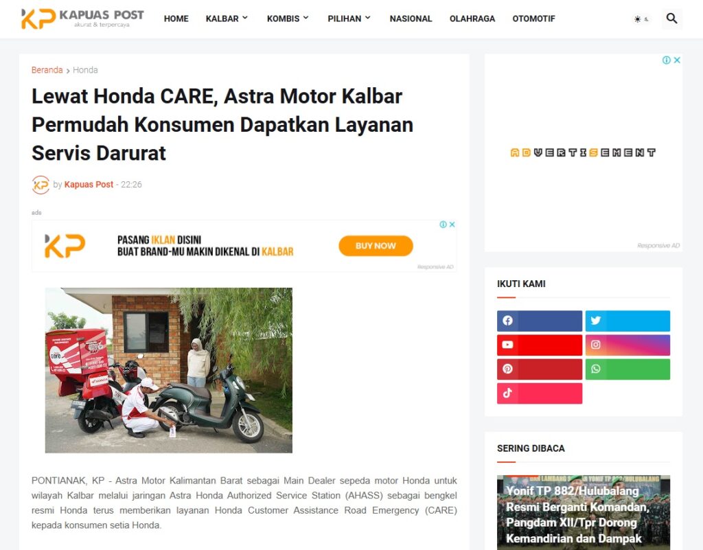 Lewat Honda CARE, Astra Motor Kalbar Permudah Konsumen Dapatkan Layanan Servis Darurat by Muhammad Arif 21 Januari 2026 in Silahkan kunjungi https://www.kapuaspost.web.id/2026/01/lewat-honda-care-astra-motor-kalbar_28.html. Tags: astra Astra Motor kalbar Astra Motor Pontianak astramotor honda kalbar pontianak sepeda motor You Might Like Regional Public Launching New ADV160 The SUV Pride Grand Launching New PCX 160 Truly Exceptional! Tetap hati-hati ya bro sist berkendara saat hujan.