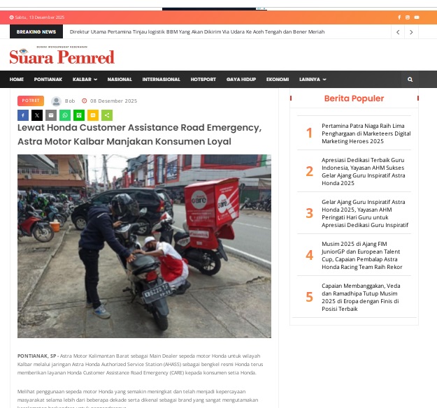 Lewat Honda Customer Assistance Road Emergency, Astra Motor Kalbar Manjakan Konsumen Loyal by masmul 8 Desember 2025 in Silahkan kunjungi https://www.suarapemredkalbar.com/read/potret/08122025/lewat-honda-customer-assistance-road-emergency-astra-motor-kalbar-manjakan-konsumen-loyal. You Might Like Regional Public Launching New ADV160 The SUV Pride Grand Launching New PCX 160 Truly Exceptional! Tetap hati-hati ya bro sist berkendara saat hujan.
