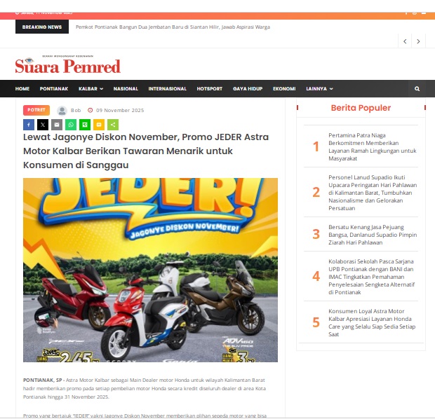 Lewat Jagonye Diskon November, Promo JEDER Astra Motor Kalbar Berikan Tawaran Menarik untuk Konsumen di Sanggau by masmul 9 November 2025 in Silahkan kunjungi https://www.suarapemredkalbar.com/read/potret/09112025/lewat-jagonye-diskon-november-promo-jeder-astra-motor-kalbar-berikan-tawaran-menarik-untuk-konsumen-di-sanggau. You Might Like Regional Public Launching New ADV160 The SUV Pride Grand Launching New PCX 160 Truly Exceptional! Tetap hati-hati ya bro sist berkendara saat hujan.