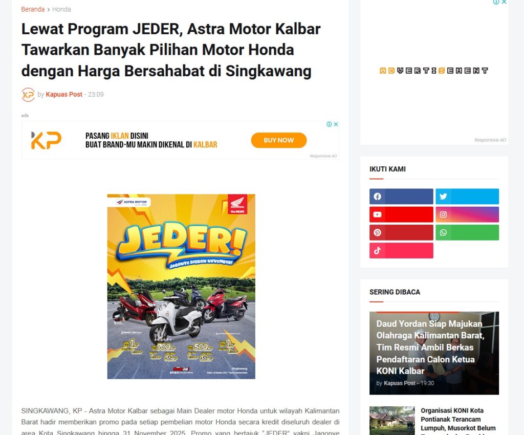 Lewat Program JEDER, Astra Motor Kalbar Tawarkan Banyak Pilihan Motor Honda dengan Harga Bersahabat di Singkawang by Muhammad Arif 21 November 2025 in Silahkan kunjungi https://www.kapuaspost.web.id/2025/11/lewat-program-jeder-astra-motor-kalbar.html. Tags: astra Astra Motor kalbar Astra Motor Pontianak astramotor honda kalbar pontianak sepeda motor You Might Like Regional Public Launching New ADV160 The SUV Pride Grand Launching New PCX 160 Truly Exceptional! Tetap hati-hati ya bro sist berkendara saat hujan.