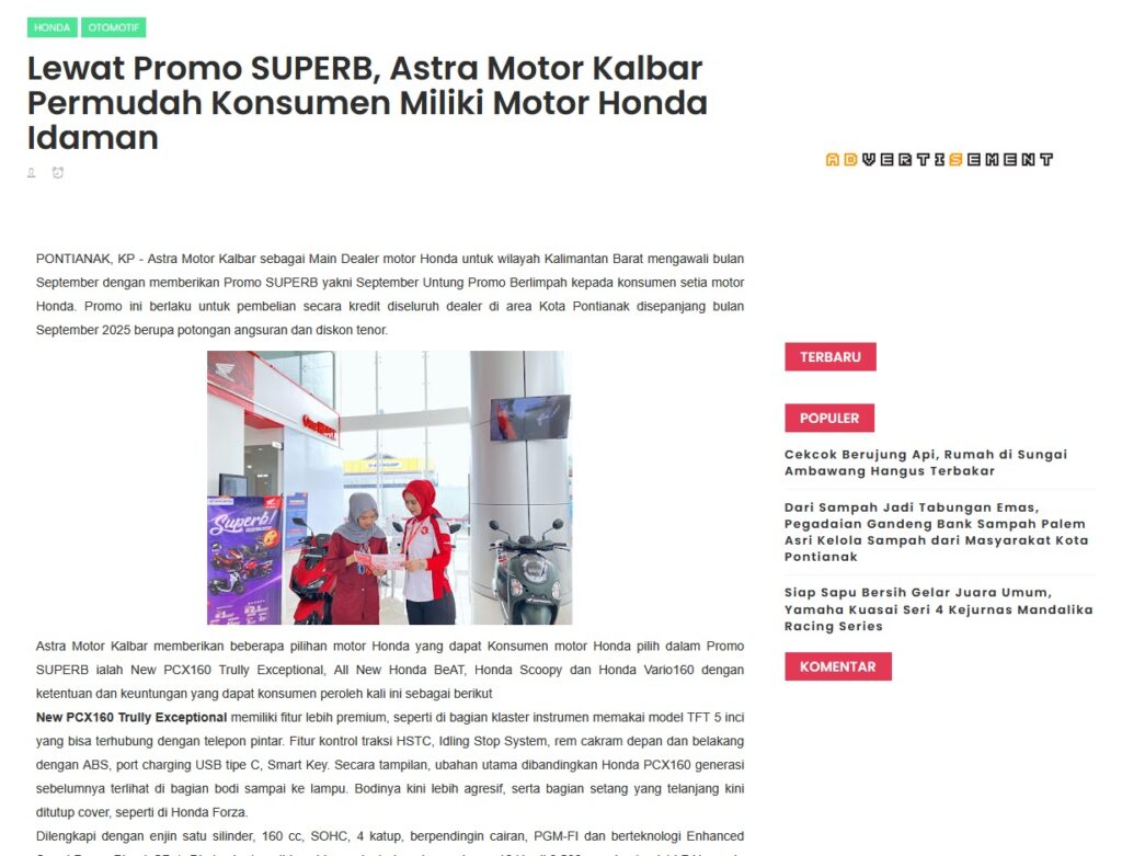 Lewat Promo SUPERB, Astra Motor Kalbar Permudah Konsumen Miliki Motor Honda Idaman by Muhammad Arif 28 September 2025 in Silahkan kunjungi https://www.kapuaspost.web.id/2025/09/lewat-promo-superb-astra-motor-kalbar_29.html. Tags: astra Astra Motor kalbar Astra Motor Pontianak astramotor honda kalbar pontianak sepeda motor You Might Like Regional Public Launching New ADV160 The SUV Pride Grand Launching New PCX 160 Truly Exceptional! Tetap hati-hati ya bro sist berkendara saat hujan.