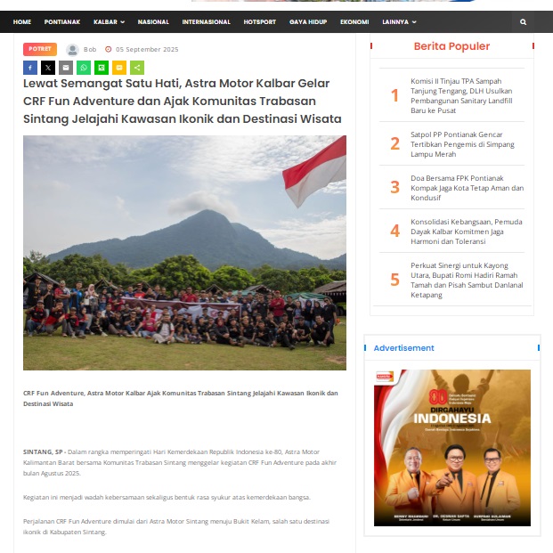 Lewat Semangat Satu Hati, Astra Motor Kalbar Gelar CRF Fun Adventure dan Ajak Komunitas Trabasan Sintang Jelajahi Kawasan Ikonik dan Destinasi Wisata by masmul 5 September 2025 in Silahkan kunjungi https://www.suarapemredkalbar.com/read/potret/05092025/lewat-semangat-satu-hati-astra-motor-kalbar-gelar-crf-fun-adventure-dan-ajak-komunitas-trabasan-sintang-jelajahi-kawasan-ikonik-dan-destinasi-wisata. You Might Like Regional Public Launching New ADV160 The SUV Pride Grand Launching New PCX 160 Truly Exceptional! Tetap hati-hati ya bro sist berkendara saat hujan.