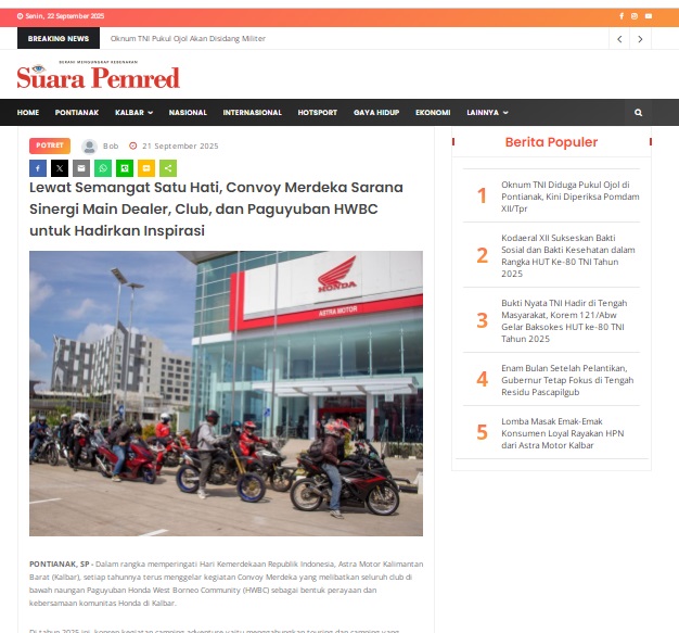 Lewat Semangat Satu Hati, Convoy Merdeka Sarana Sinergi Main Dealer, Club, dan Paguyuban HWBC untuk Hadirkan Inspirasi by masmul 21 September 2025 in Silahkan kunjungi https://www.suarapemredkalbar.com/read/potret/21092025/lewat-semangat-satu-hati-convoy-merdeka-sarana-sinergi-main-dealer-club-dan-paguyuban-hwbc-untuk-hadirkan-inspirasi. You Might Like Regional Public Launching New ADV160 The SUV Pride Grand Launching New PCX 160 Truly Exceptional! Tetap hati-hati ya bro sist berkendara saat hujan.