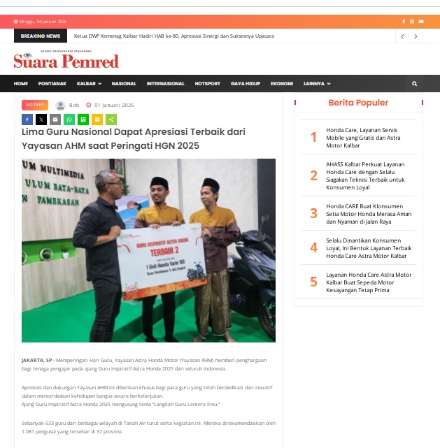 Lima Guru Nasional Dapat Apresiasi Terbaik dari Yayasan AHM saat Peringati HGN 2025 by masmul 1 Januari 2026 in Silahkan kunjungi https://www.suarapemredkalbar.com/read/potret/01012026/lima-guru-nasional-dapat-apresiasi-terbaik-dari-yayasan-ahm-saat-peringati-hgn-2025. You Might Like Regional Public Launching New ADV160 The SUV Pride Grand Launching New PCX 160 Truly Exceptional! Tetap hati-hati ya bro sist berkendara saat hujan.