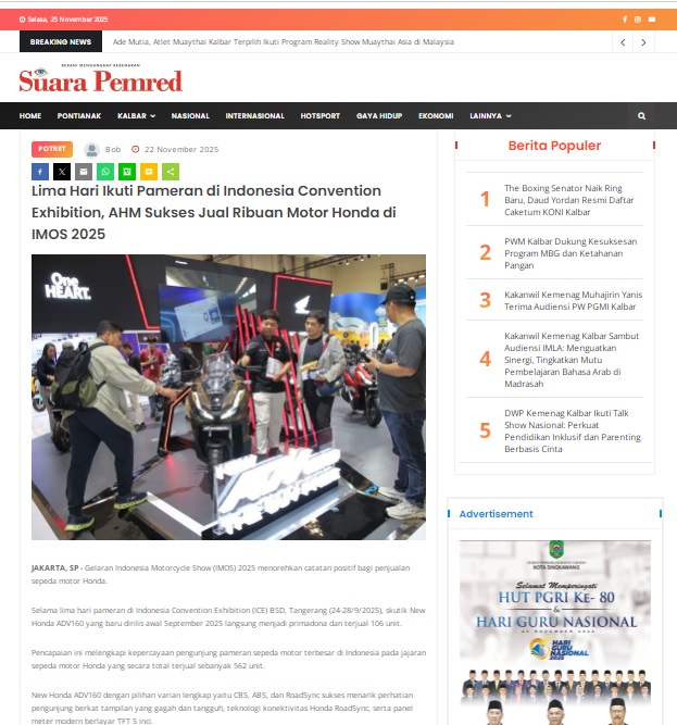 Lima Hari Ikuti Pameran di Indonesia Convention Exhibition, AHM Sukses Jual Ribuan Motor Honda di IMOS 2025 by masmul 22 November 2025 in Silahkan kunjungi https://www.suarapemredkalbar.com/read/potret/22112025/lima-hari-ikuti-pameran-di-indonesia-convention-exhibition-ahm-sukses-jual-ribuan-motor-honda-di-imos-2025. You Might Like Regional Public Launching New ADV160 The SUV Pride Grand Launching New PCX 160 Truly Exceptional! Tetap hati-hati ya bro sist berkendara saat hujan.
