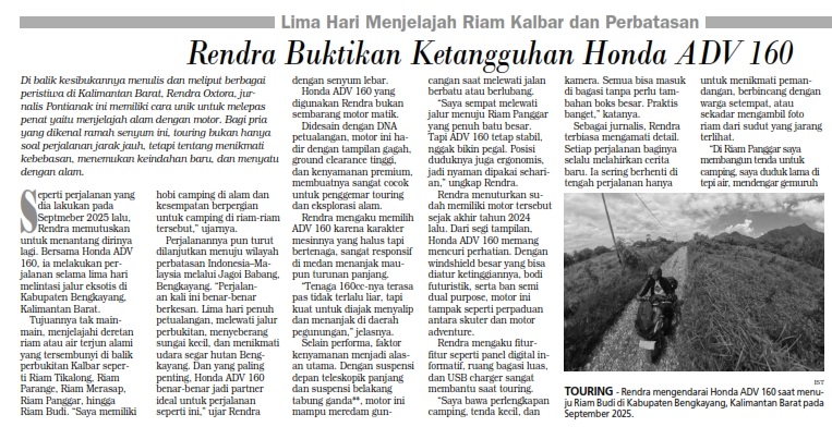 Lima Hari Menjelajah Riam Kalbar dan Perbatasan Rendra Buktikan Ketangguhan Honda ADV 160 by Nina Soraya 16 November 2025 in Silahkan buka . You Might Like Regional Public Launching New ADV160 The SUV Pride Grand Launching New PCX 160 Truly Exceptional! Tetap hati-hati ya bro sist berkendara saat hujan.