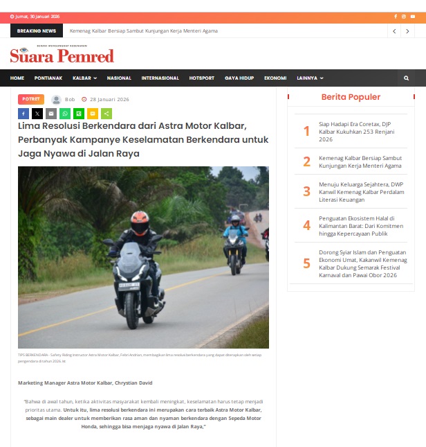 Lima Resolusi Berkendara dari Astra Motor Kalbar, Perbanyak Kampanye Keselamatan Berkendara untuk Jaga Nyawa di Jalan Raya by masmul 28 Januari 2026 in Silahkan kunjungi https://www.suarapemredkalbar.com/read/potret/28012026/lima-resolusi-berkendara-dari-astra-motor-kalbar-perbanyak-kampanye-keselamatan-berkendara-untuk-jaga-nyawa-di-jalan-raya. You Might Like Regional Public Launching New ADV160 The SUV Pride Grand Launching New PCX 160 Truly Exceptional! Tetap hati-hati ya bro sist berkendara saat hujan.