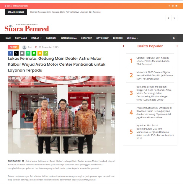 Lukas Ferinata: Gedung Main Dealer Astra Motor Kalbar Wujud Astra Motor Center Pontianak untuk Layanan Terpadu by masmul 21 Desember 2025 in Silahkan kunjungi https://www.suarapemredkalbar.com/read/potret/21122025/lukas-ferinata-gedung-main-dealer-astra-motor-kalbar-wujud-astra-motor-center-pontianak-untuk-layanan-terpadu. You Might Like Regional Public Launching New ADV160 The SUV Pride Grand Launching New PCX 160 Truly Exceptional! Tetap hati-hati ya bro sist berkendara saat hujan.