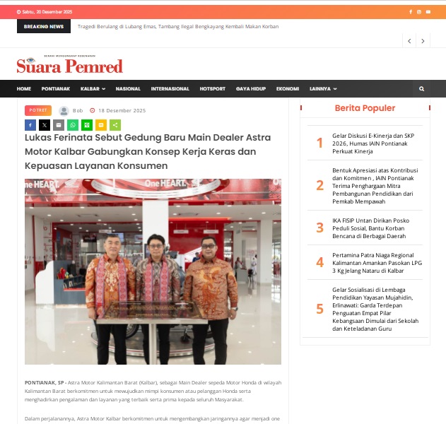 Lukas Ferinata Sebut Gedung Baru Main Dealer Astra Motor Kalbar Gabungkan Konsep Kerja Keras dan Kepuasan Layanan Konsumen by masmul 18 Desember 2025 in Silahkan kunjungi https://www.suarapemredkalbar.com/read/potret/18122025/lukas-ferinata-sebut-gedung-baru-main-dealer-astra-motor-kalbar-gabungkan-konsep-kerja-keras-dan-kepuasan-layanan-konsumen. You Might Like Regional Public Launching New ADV160 The SUV Pride Grand Launching New PCX 160 Truly Exceptional! Tetap hati-hati ya bro sist berkendara saat hujan.