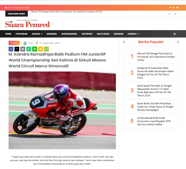 M. Kiandra Ramadhipa Bidik Podium FIM JuniorGP World Championship Seri Kelima di Sirkuit Misano World Circuit Marco Simoncelli by masmul 19 September 2025 in Silahkan kunjungi https://www.suarapemredkalbar.com/read/potret/19092025/m-kiandra-ramadhipa-bidik-podium-fim-juniorgp-world-championship-seri-kelima-di-sirkuit-misano-world-circuit-marco-simoncelli. You Might Like Regional Public Launching New ADV160 The SUV Pride Grand Launching New PCX 160 Truly Exceptional! Tetap hati-hati ya bro sist berkendara saat hujan.