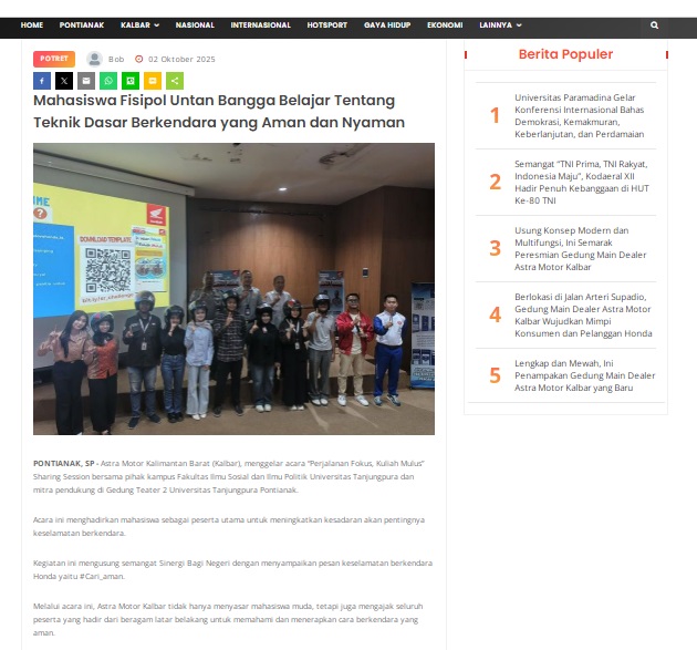 Mahasiswa Fisipol Untan Bangga Belajar Tentang Teknik Dasar Berkendara yang Aman dan Nyaman by masmul 2 Oktober 2025 in Silahkan kunjungi https://www.suarapemredkalbar.com/read/potret/02102025/mahasiswa-fisipol-untan-bangga-belajar-tentang-teknik-dasar-berkendara-yang-aman-dan-nyaman. You Might Like Regional Public Launching New ADV160 The SUV Pride Grand Launching New PCX 160 Truly Exceptional! Tetap hati-hati ya bro sist berkendara saat hujan.