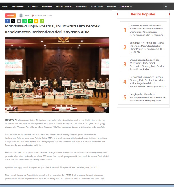 Mahasiswa Unjuk Prestasi, Ini Jawara Film Pendek Keselamatan Berkendara dari Yayasan AHM by masmul 3 Oktober 2025 in Silahkan kunjungi https://www.suarapemredkalbar.com/read/potret/03102025/mahasiswa-unjuk-prestasi-ini-jawara-film-pendek-keselamatan-berkendara-dari-yayasan-ahm. You Might Like Regional Public Launching New ADV160 The SUV Pride Grand Launching New PCX 160 Truly Exceptional! Tetap hati-hati ya bro sist berkendara saat hujan.