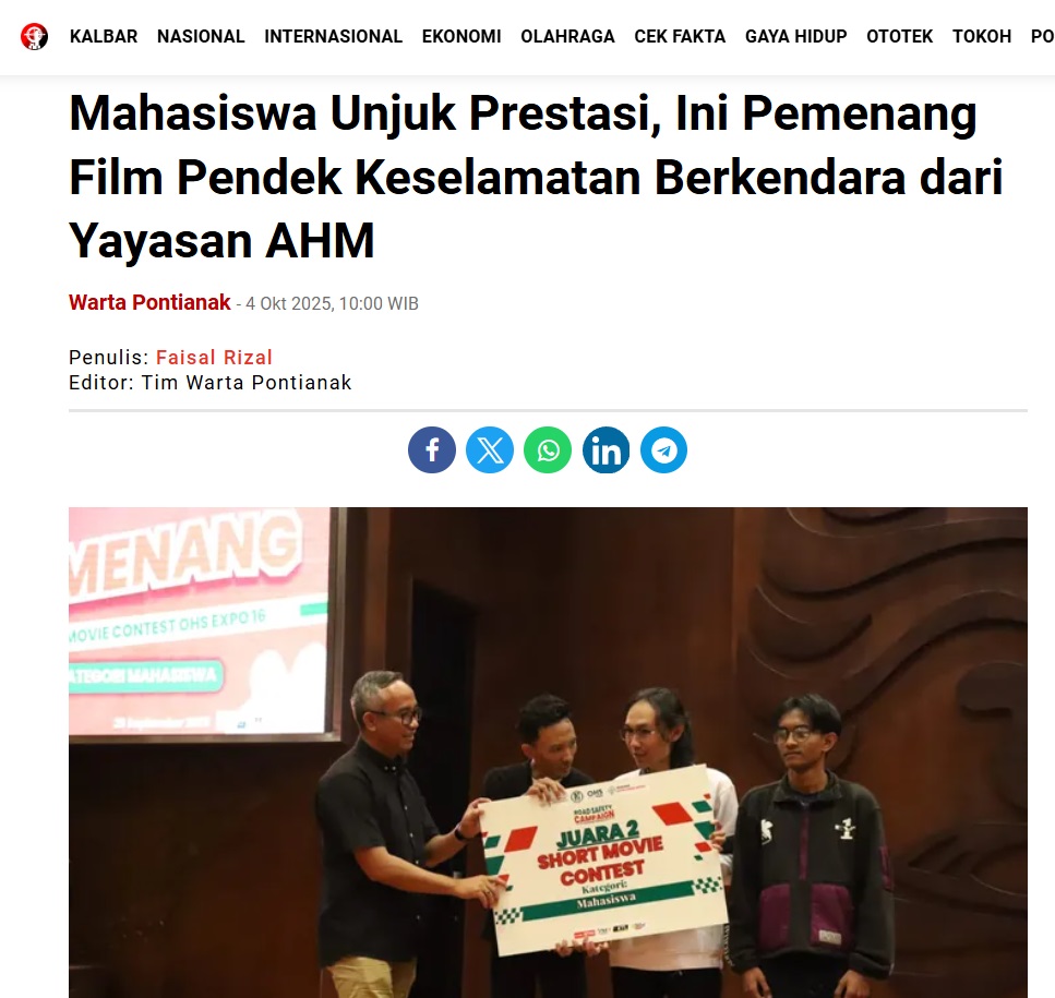 Mahasiswa Unjuk Prestasi, Ini Pemenang Film Pendek Keselamatan Berkendara dari Yayasan AHM by Faisal Rizal 4 Oktober 2025 in Silahkan kunjungi https://wartapontianak.pikiran-rakyat.com/gaya-hidup/pr-1179693617/mahasiswa-unjuk-prestasi-ini-pemenang-film-pendek-keselamatan-berkendara-dari-yayasan-ahm. You Might Like Regional Public Launching New ADV160 The SUV Pride Grand Launching New PCX 160 Truly Exceptional! Tetap hati-hati ya bro sist berkendara saat hujan.