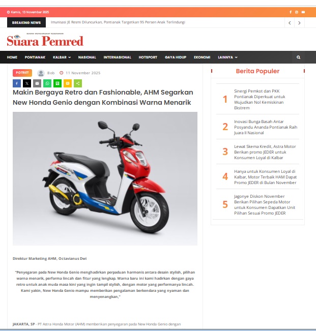 Makin Bergaya Retro dan Fashionable, AHM Segarkan New Honda Genio dengan Kombinasi Warna Menarik by masmul 11 November 2025 in Silahkan kunjungi https://www.suarapemredkalbar.com/read/potret/11112025/makin-bergaya-retro-dan-fashionable-ahm-segarkan-new-honda-genio-dengan-kombinasi-warna-menarik. You Might Like Regional Public Launching New ADV160 The SUV Pride Grand Launching New PCX 160 Truly Exceptional! Tetap hati-hati ya bro sist berkendara saat hujan.