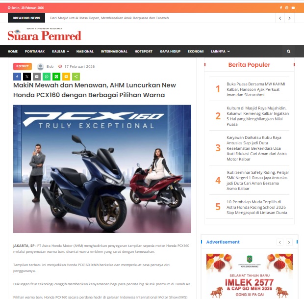MakiN Mewah dan Menawan, AHM Luncurkan New Honda PCX160 dengan Berbagai Pilihan Warna by masmul 17 Februari 2026 in Silahkan kunjungi https://www.suarapemredkalbar.com/read/potret/17022026/makin-mewah-dan-menawan-ahm-luncurkan-new-honda-pcx160-dengan-berbagai-pilihan-warna. You Might Like Regional Public Launching New ADV160 The SUV Pride Grand Launching New PCX 160 Truly Exceptional! Tetap hati-hati ya bro sist berkendara saat hujan.