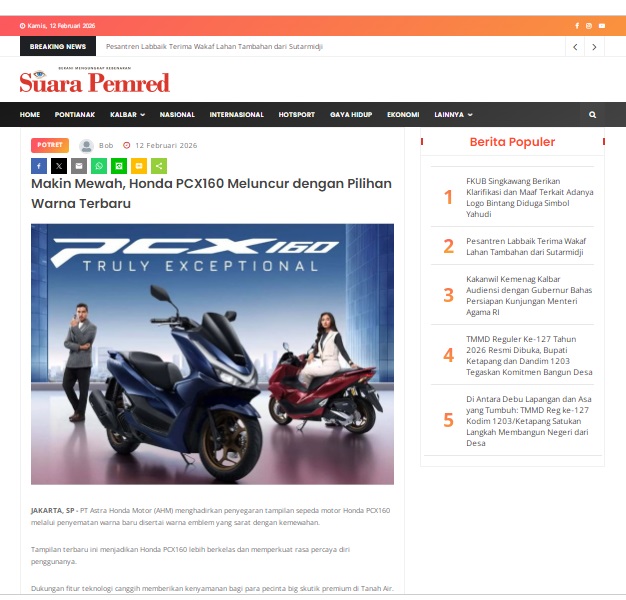 Makin Mewah, Honda PCX160 Meluncur dengan Pilihan Warna Terbaru by masmul 12 Februari 2026 in Silahkan kunjungi https://www.suarapemredkalbar.com/read/potret/12022026/makin-mewah-honda-pcx160-meluncur-dengan-pilihan-warna-terbaru. You Might Like Regional Public Launching New ADV160 The SUV Pride Grand Launching New PCX 160 Truly Exceptional! Tetap hati-hati ya bro sist berkendara saat hujan.