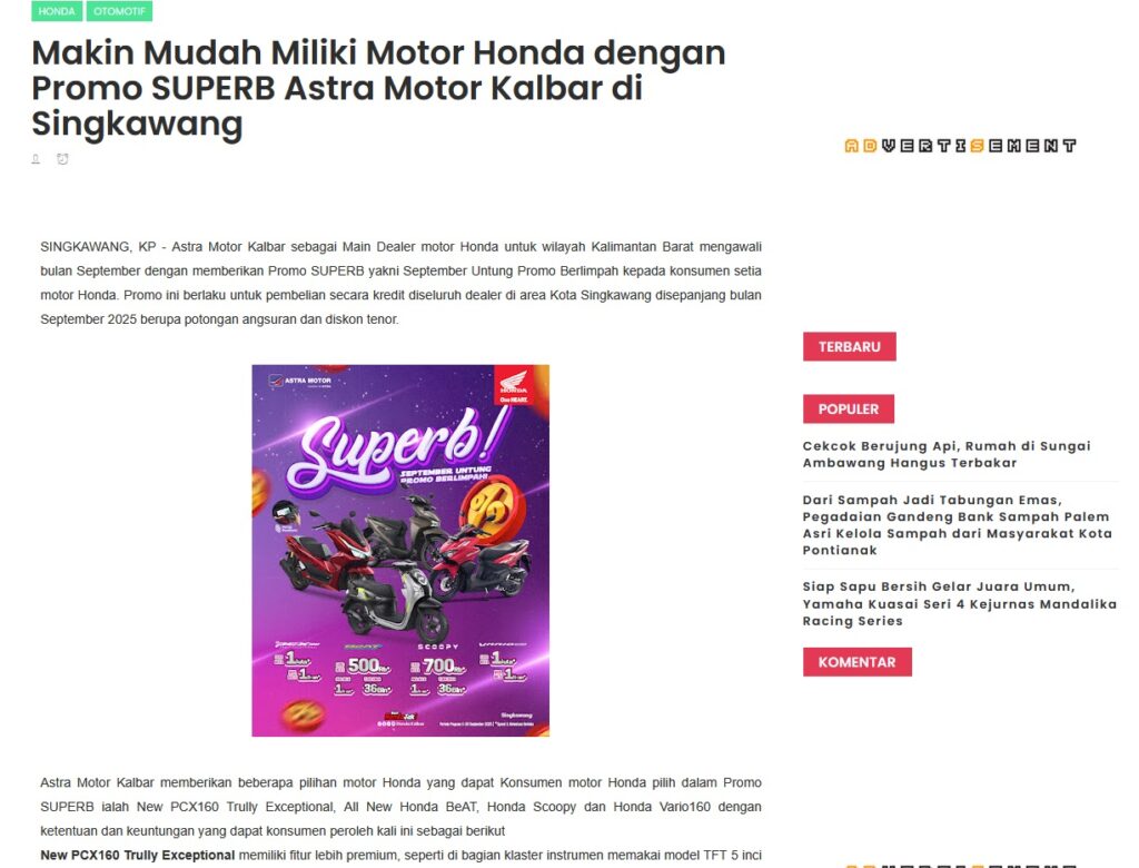 Makin Mudah Miliki Motor Honda dengan Promo SUPERB Astra Motor Kalbar di Singkawang by Muhammad Arif 20 September 2025 in Silahkan kunjungi https://www.kapuaspost.web.id/2025/09/makin-mudah-miliki-motor-honda-dengan.html. Tags: astra Astra Motor kalbar Astra Motor Pontianak astramotor honda kalbar pontianak sepeda motor You Might Like Regional Public Launching New ADV160 The SUV Pride Grand Launching New PCX 160 Truly Exceptional! Tetap hati-hati ya bro sist berkendara saat hujan.