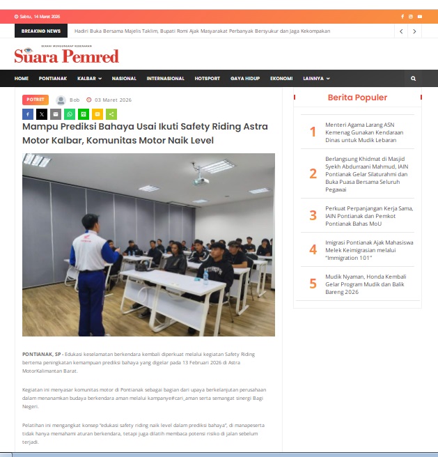 Mampu Prediksi Bahaya Usai Ikuti Safety Riding Astra Motor Kalbar, Komunitas Motor Naik Level by masmul 3 Maret 2026 in Silahkan kunjungi https://www.suarapemredkalbar.com/read/potret/03032026/mampu-prediksi-bahaya-usai-ikuti-safety-riding-astra-motor-kalbar-komunitas-motor-naik-level. You Might Like Regional Public Launching New ADV160 The SUV Pride Grand Launching New PCX 160 Truly Exceptional! Tetap hati-hati ya bro sist berkendara saat hujan.