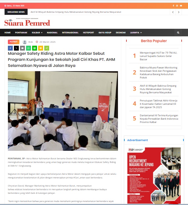 Manager Safety Riding Astra Motor Kalbar Sebut Program Kunjungan ke Sekolah jadi Ciri Khas PT. AHM Selamatkan Nyawa di Jalan Raya by masmul 20 Maret 2025 in Silahkan kunjungi https://www.suarapemredkalbar.com/read/potret/20032025/manager-safety-riding-astra-motor-kalbar-sebut-program-kunjungan-ke-sekolah-jadi-ciri-khas-pt-ahm-selamatkan-nyawa-di-jalan-raya. You Might Like Regional Public Launching New ADV160 The SUV Pride Grand Launching New PCX 160 Truly Exceptional! Tetap hati-hati ya bro sist berkendara saat hujan.