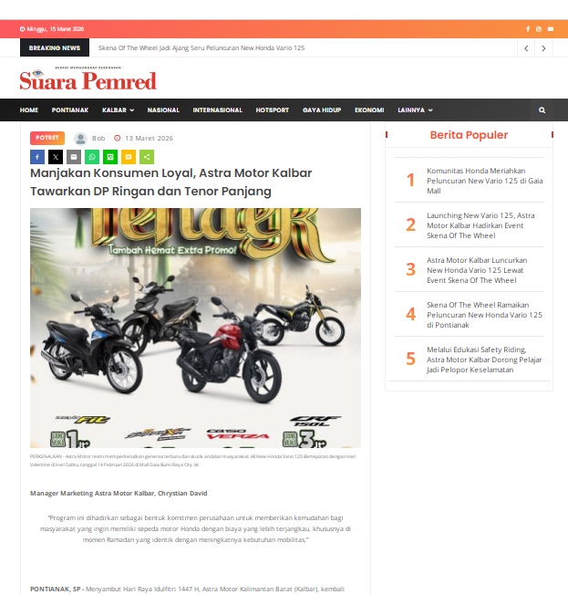 Manjakan Konsumen Loyal, Astra Motor Kalbar Tawarkan DP Ringan dan Tenor Panjang by masmul 13 Maret 2026 in Silahkan kunjungi https://www.suarapemredkalbar.com/read/potret/13032026/manjakan-konsumen-loyal-astra-motor-kalbar-tawarkan-dp-ringan-dan-tenor-panjang. You Might Like Regional Public Launching New ADV160 The SUV Pride Grand Launching New PCX 160 Truly Exceptional! Tetap hati-hati ya bro sist berkendara saat hujan.
