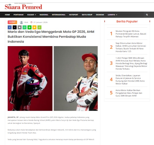 Mario dan Veda Ega Menggebrak Moto GP 2026, AHM Buktikan Konsistensi Membina Pembalap Muda Indonesia by masmul 21 Januari 2026 in Silahkan kunjungi https://www.suarapemredkalbar.com/read/potret/21012026/mario-dan-veda-ega-menggebrak-moto-gp-2026-ahm-buktikan-konsistensi-membina-pembalap-muda-indonesia. You Might Like Regional Public Launching New ADV160 The SUV Pride Grand Launching New PCX 160 Truly Exceptional! Tetap hati-hati ya bro sist berkendara saat hujan.