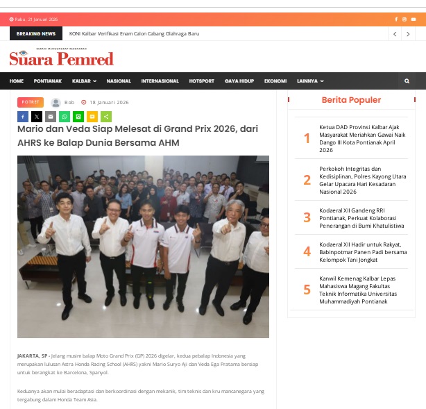 Mario dan Veda Siap Melesat di Grand Prix 2026, dari AHRS ke Balap Dunia Bersama AHM by masmul 18 Januari 2026 in Silahkan kunjungi https://www.suarapemredkalbar.com/read/potret/18012026/mario-dan-veda-siap-melesat-di-grand-prix-2026-dari-ahrs-ke-balap-dunia-bersama-ahm. You Might Like Regional Public Launching New ADV160 The SUV Pride Grand Launching New PCX 160 Truly Exceptional! Tetap hati-hati ya bro sist berkendara saat hujan.