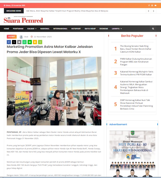 Marketing Promotion Astra Motor Kalbar Jelaskan Promo Jeder Bisa Dipesan Lewat Motorku X by masmul 22 November 2025 in Silahkan kunjungi https://www.suarapemredkalbar.com/read/potret/22112025/marketing-promotion-astra-motor-kalbar-jelaskan-promo-jeder-bisa-dipesan-lewat-motorku-x. You Might Like Regional Public Launching New ADV160 The SUV Pride Grand Launching New PCX 160 Truly Exceptional! Tetap hati-hati ya bro sist berkendara saat hujan.