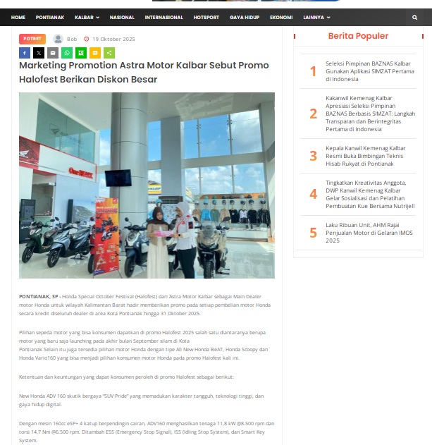 Marketing Promotion Astra Motor Kalbar Sebut Promo Halofest Berikan Diskon Besar by masmul 19 Oktober 2025 in Silahkan kunjungi https://www.suarapemredkalbar.com/read/potret/19102025/marketing-promotion-astra-motor-kalbar-sebut-promo-halofest-berikan-diskon-besar. You Might Like Regional Public Launching New ADV160 The SUV Pride Grand Launching New PCX 160 Truly Exceptional! Tetap hati-hati ya bro sist berkendara saat hujan.