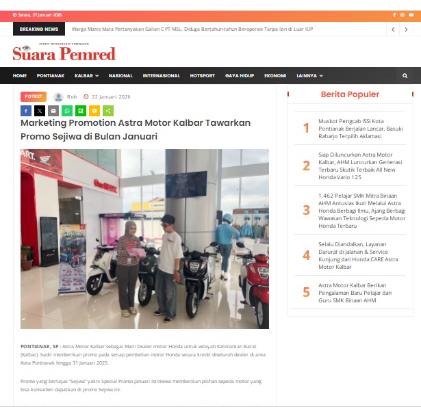 Marketing Promotion Astra Motor Kalbar Tawarkan Promo Sejiwa di Bulan Januari by masmul 22 Januari 2026 in Silahkan kunjungi https://www.suarapemredkalbar.com/read/potret/22012026/marketing-promotion-astra-motor-kalbar-tawarkan-promo-sejiwa-di-bulan-januari. You Might Like Regional Public Launching New ADV160 The SUV Pride Grand Launching New PCX 160 Truly Exceptional! Tetap hati-hati ya bro sist berkendara saat hujan.