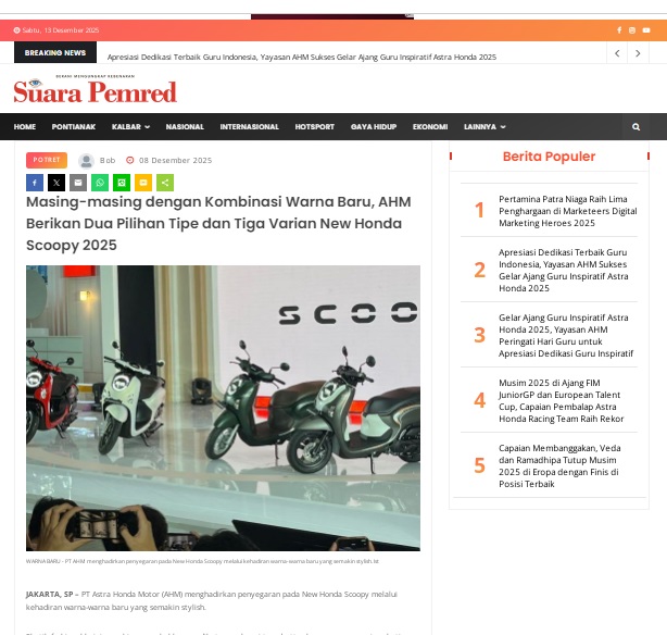 Masing-masing dengan Kombinasi Warna Baru, AHM Berikan Dua Pilihan Tipe dan Tiga Varian New Honda Scoopy 2025 by masmul 8 Desember 2025 in Silahkan kunjungi https://www.suarapemredkalbar.com/read/potret/08122025/masing-masing-dengan-kombinasi-warna-baru-ahm-berikan-dua-pilihan-tipe-dan-tiga-varian-new-honda-scoopy-2025. You Might Like Regional Public Launching New ADV160 The SUV Pride Grand Launching New PCX 160 Truly Exceptional! Tetap hati-hati ya bro sist berkendara saat hujan.