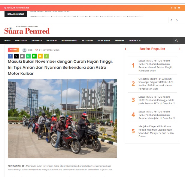 Masuki Bulan November dengan Curah Hujan Tinggi, Ini Tips Aman dan Nyaman Berkendara dari Astra Motor Kalbar by masmul 1 November 2025 in Silahkan kunjungi https://www.suarapemredkalbar.com/read/potret/01112025/masuki-bulan-november-dengan-curah-hujan-tinggi-ini-tips-aman-dan-nyaman-berkendara-dari-astra-motor-kalbar. You Might Like Regional Public Launching New ADV160 The SUV Pride Grand Launching New PCX 160 Truly Exceptional! Tetap hati-hati ya bro sist berkendara saat hujan.
