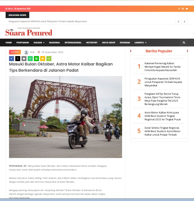 Masuki Bulan Oktober, Astra Motor Kalbar Bagikan Tips Berkendara di Jalanan Padat by masmul 29 September 2025 in Silahkan kunjungi https://www.suarapemredkalbar.com/read/potret/29092025/masuki-bulan-oktober-astra-motor-kalbar-bagikan-tips-berkendara-di-jalanan-padat. You Might Like Regional Public Launching New ADV160 The SUV Pride Grand Launching New PCX 160 Truly Exceptional! Tetap hati-hati ya bro sist berkendara saat hujan.