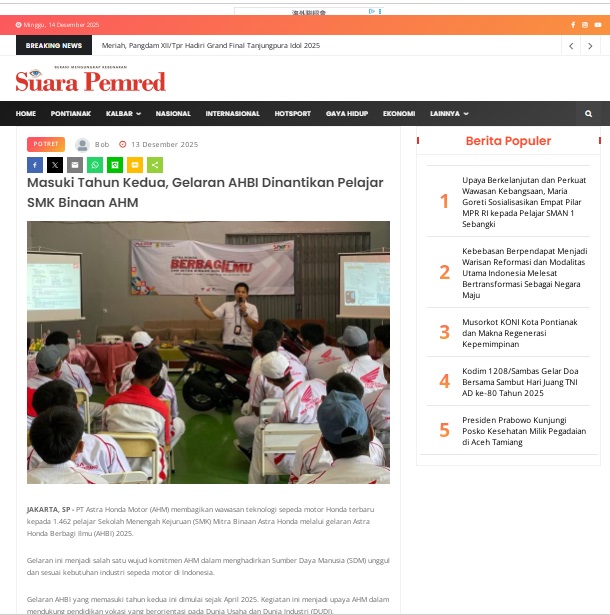 Masuki Tahun Kedua, Gelaran AHBI Dinantikan Pelajar SMK Binaan AHM by masmul 13 Desember 2025 in Silahkan kunjungi https://www.suarapemredkalbar.com/read/potret/13122025/masuki-tahun-kedua-gelaran-ahbi-dinantikan-pelajar-smk-binaan-ahm. You Might Like Regional Public Launching New ADV160 The SUV Pride Grand Launching New PCX 160 Truly Exceptional! Tetap hati-hati ya bro sist berkendara saat hujan.