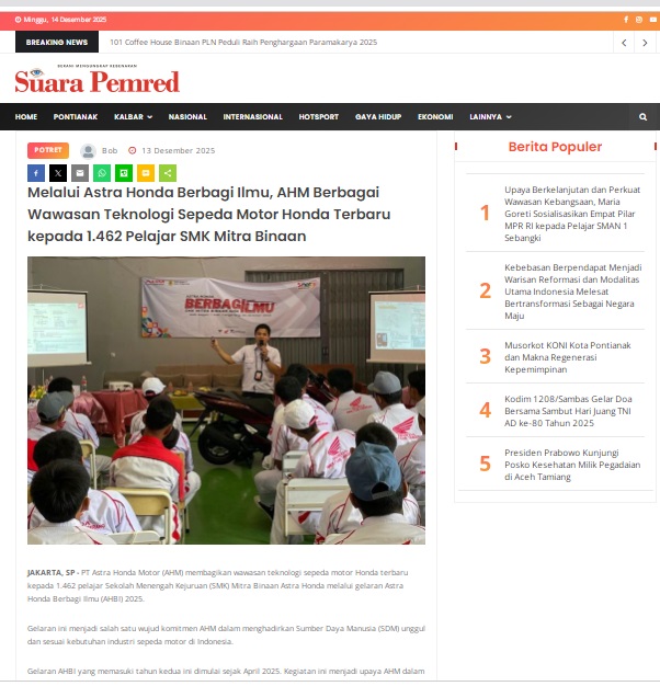 Melalui Astra Honda Berbagi Ilmu, AHM Berbagai Wawasan Teknologi Sepeda Motor Honda Terbaru kepada 1.462 Pelajar SMK Mitra Binaan by masmul 13 Desember 2025 in Silahkan kunjungi https://www.suarapemredkalbar.com/read/potret/13122025/melalui-astra-honda-berbagi-ilmu-ahm-berbagai-wawasan-teknologi-sepeda-motor-honda-terbaru-kepada-1462-pelajar-smk-mitra-binaan. You Might Like Regional Public Launching New ADV160 The SUV Pride Grand Launching New PCX 160 Truly Exceptional! Tetap hati-hati ya bro sist berkendara saat hujan.